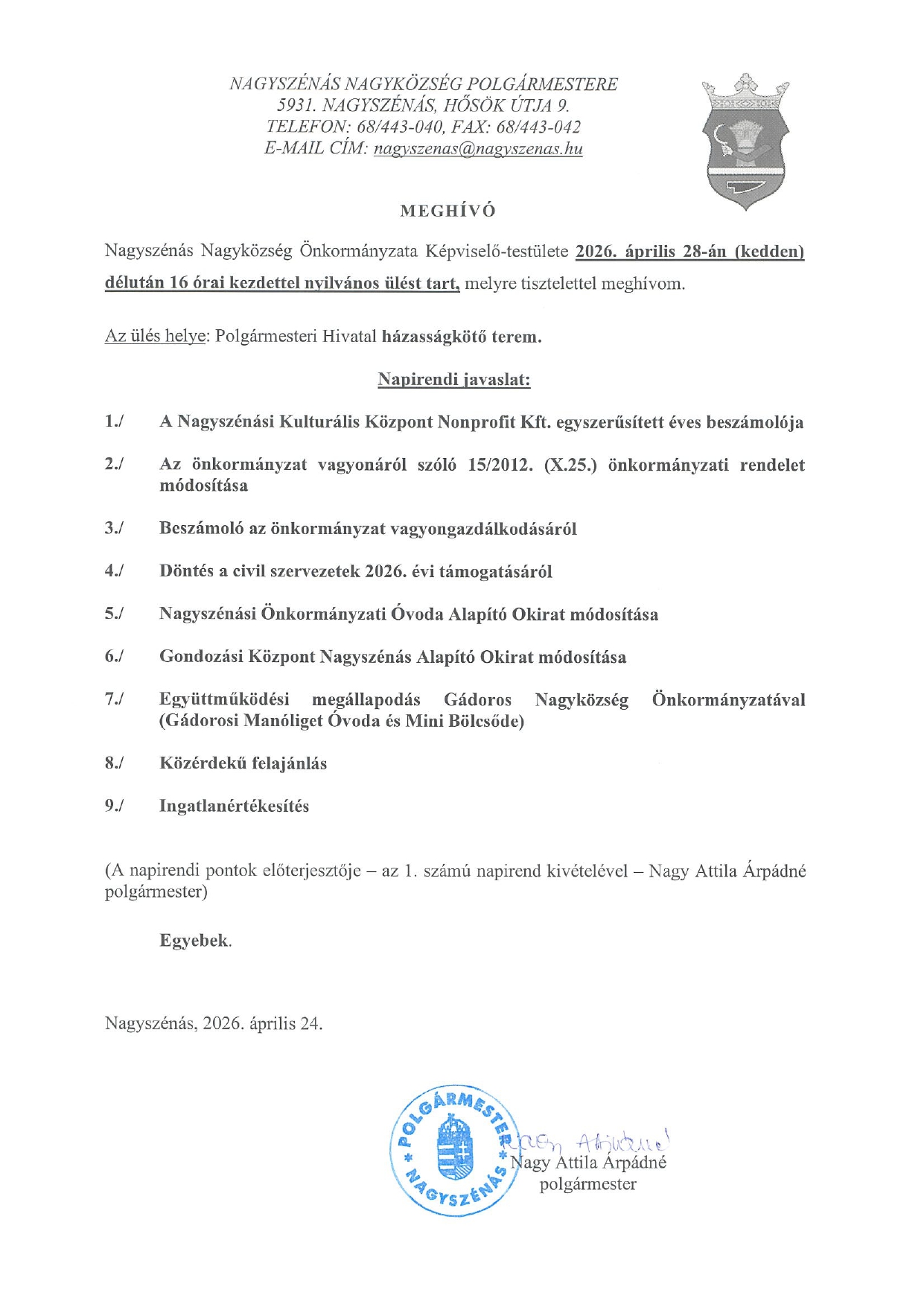 Meghívó Képviselő-testületi ülésre Krasznai Eszter 2026-04-24 Meghívó Képviselő-testületi ülésre2026-04-24T11:42:33+00:00 Filed under Egyéb Related Posts MÁV vegyszeres gyomirtás2026. évi I. vegyszeres gyomirtási ütemterv A MÁV Zrt vegyszeres gyomirtá Nagyszénás Havilap – 2026. április OTP Mozgó bankfiók időpontváltozás Felhívás emlőszűrésre Ebzárlat és legeltetési tilalomHATÁROZAT az ebzárlatról