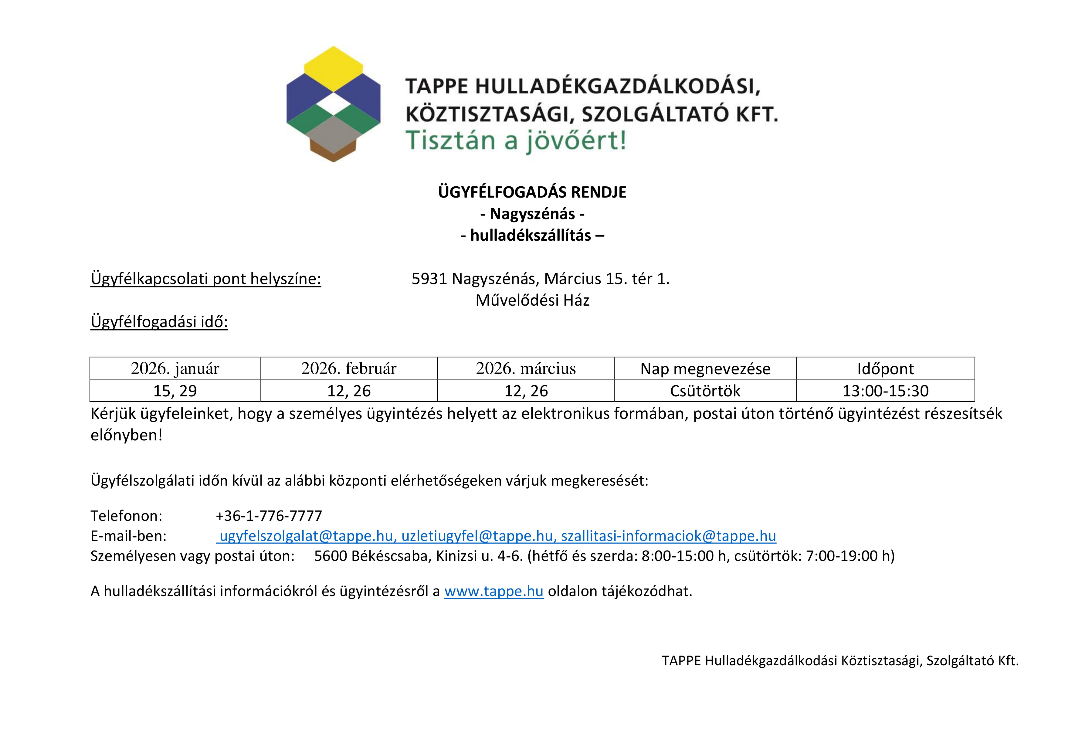 Hulladékszállítás admin 2019-05-29 Hulladékszállítás2025-12-23T15:56:27+00:00 Nagyszénás 2026. I. negyedév ügyfélfogadási rend Nagyszénás 2026. évi hulladékszállítási naptár és tájékoztató